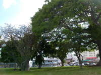 Here is this "tiny" baobab as it looks if you try to take pictures without including the larger trees. Notice the board of water supply building behind it -- this baobab is "only" four stories tall.